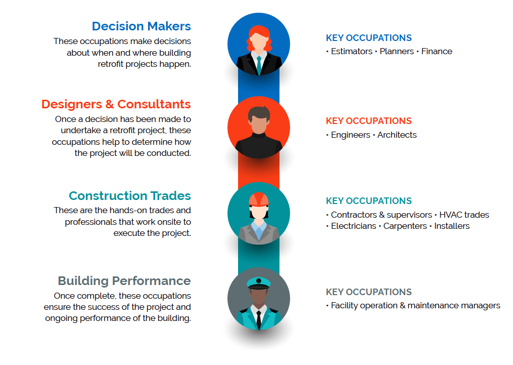 Governments, employers, and educators must be focused on reskilling existing workers and growing the workforce by removing the stigma associated with trades and reaching underrepresented groups. The right resources and supports need to be in place as retrofit activity accelerates in the face of the rising cost of carbon. Enhancing expertise and knowledge across the retrofit spectrum, however, including among decision-makers, designers, financing experts and consultants, will help to address the complexity and capital constraints associated with retrofit investments.