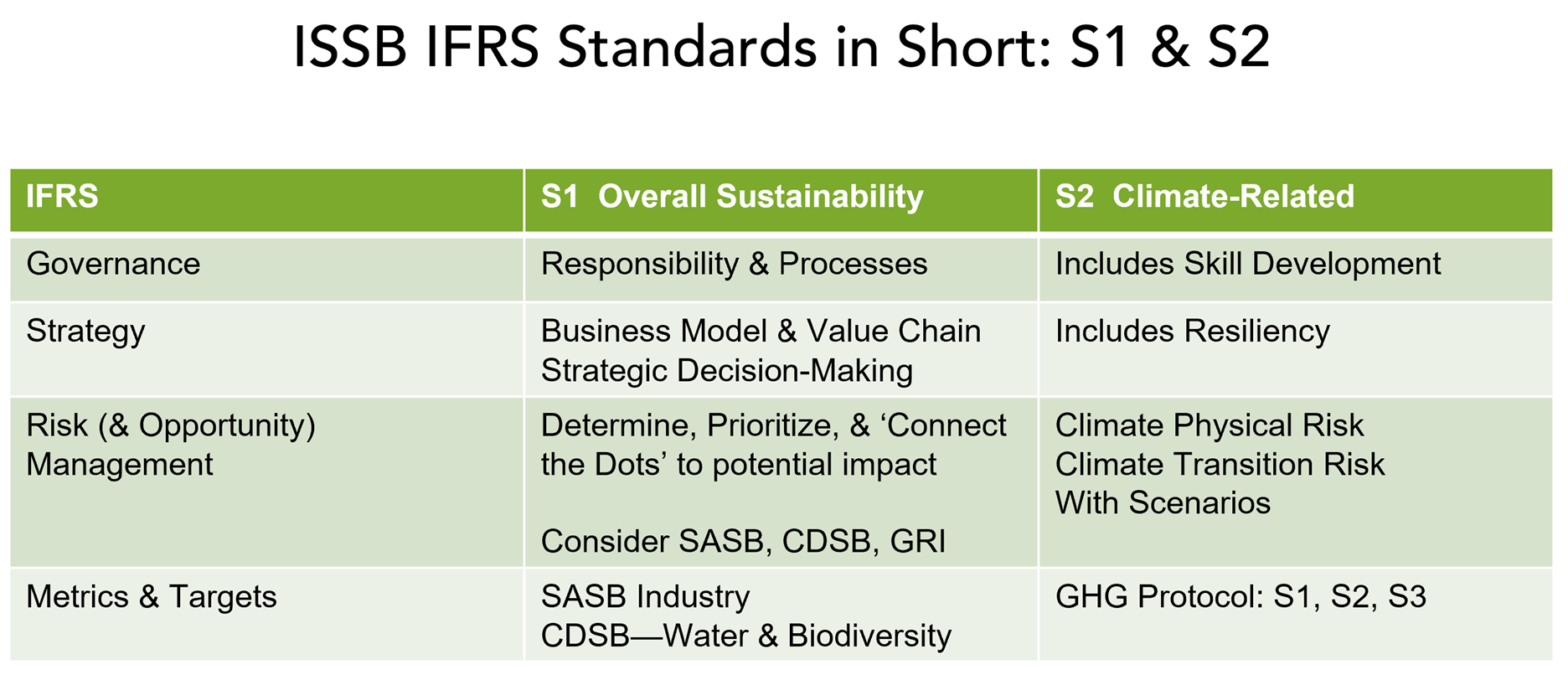 Strategy answers the question: ‘What are you doing (and why)?’ It’s central to the firm—not a ‘special effort’ led by a group that is ‘off to the side.’ The standards are very broad—they include business model and value chain and the processes by which strategic decisions are made. In the climate-related standard (S2), it specifically calls for resiliency.