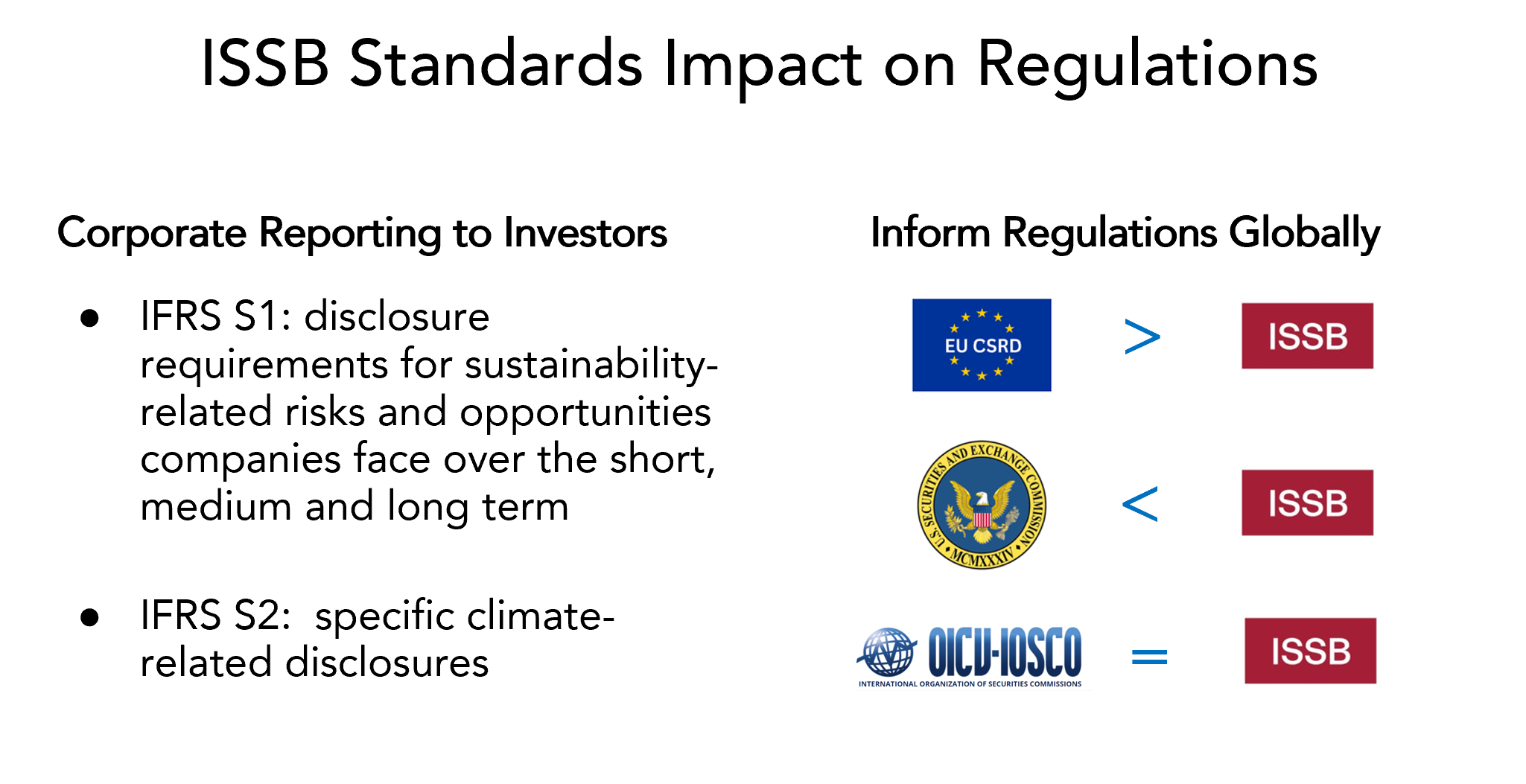 The International Organization of Securities Commissions—also known as IOSCO—has already endorsed the standards. The ISSB has also worked closely with American, European, Japanese, and Chinese officials to develop its rules as a global baseline and work on interoperability between jurisdictions, but it won’t be perfect. For example, in the US, the still-to-be-finalized Securities and Exchange Commission rules are expected to be a lighter touch than the ISSB (IFRS S1, IFRS S2) standards. The EU Sustainability Reporting Standards, published July 31, 2023, will require more. They do require companies to provide information for investors to understand the sustainability impact of the companies in which they invest, as articulated by the ISSB, but they also require more disclosure, particularly for stakeholders beyond investors (with a specific acknowledgement to the GRI).