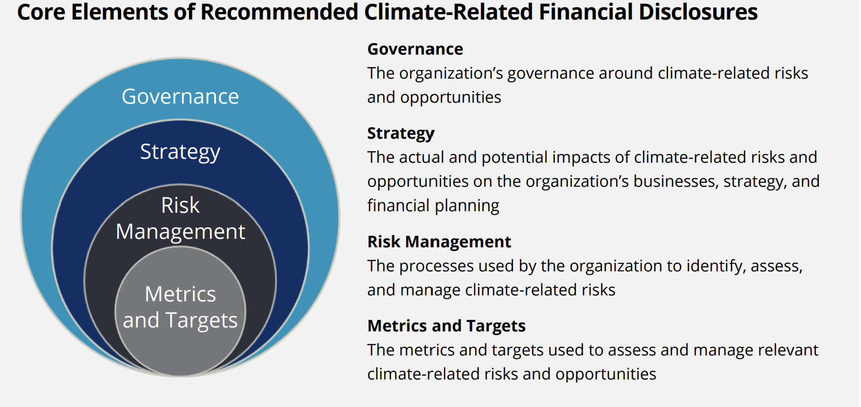 The standards require information structured around 4 thematic areas that represent the core elements of how companies operate: governance, strategy, risk management, and metrics and targets. That’s a direct result of the TCFD recommendations, published in 2017 (and already used by a number of leading firms).
