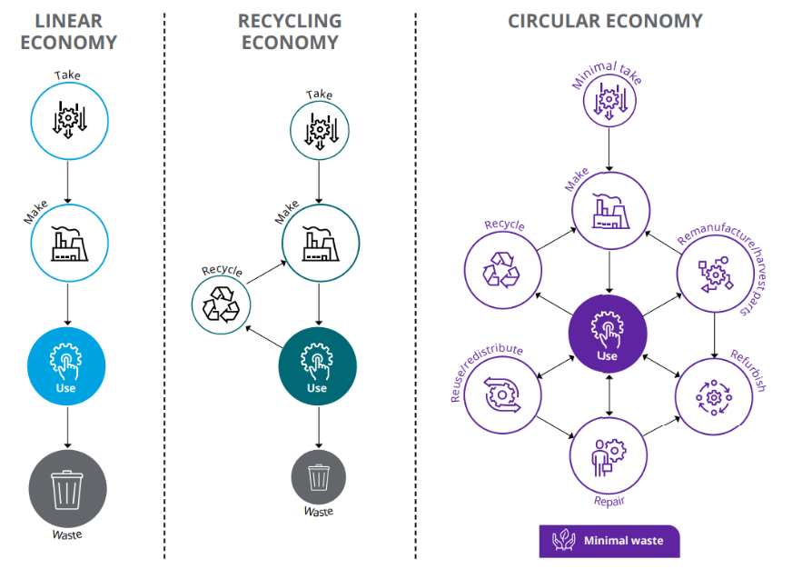The circular economy moves the needle from traditional “linear” economies, where products are made, used and then discarded, although now sometimes recycled, reducing some waste. The circular economy goes much further by creating a virtuous circle around use that includes making, repairing, refurbishing, reusing, remanufacturing and recycling.