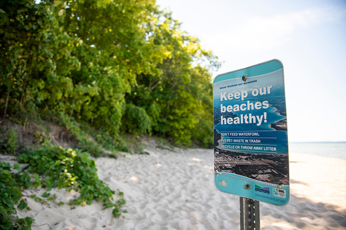 A sign at the Old Mission Lighthouse Park beach in Traverse City promotes beach sustainability practice. (Kaytie Boomer | MLive.com)