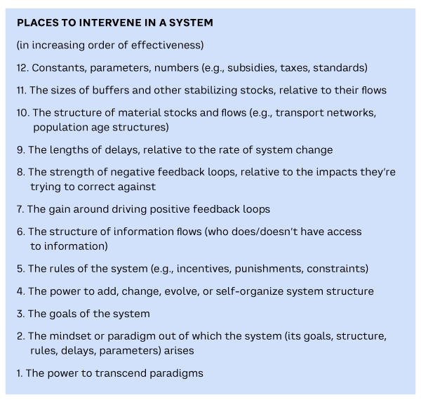 In Donella Meadows ‘s article Leverage Points: Places to Intervene in a System, she describes sitting in a meeting about how new global trade regimes would (supposedly) make the world function better. She was getting upset at what she heard and eventually became so angry about the direction she believed the new regime would take the world that she interrupted the meeting by getting up, marching to the flip chart, turning to a blank sheet, and writing a list showing how, in complex systems, leverage points are not intuitive:
