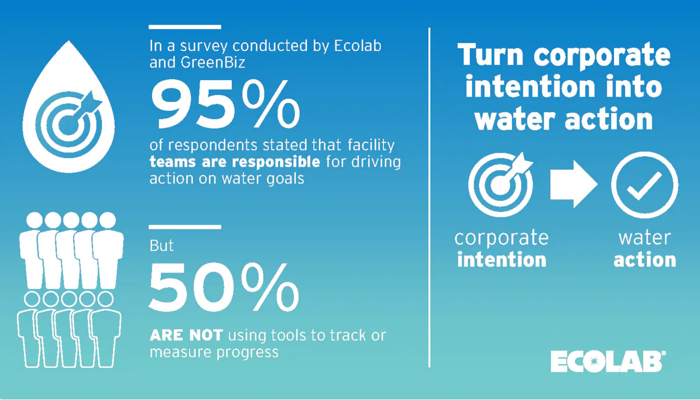 While water targets and goals are typically set by sustainability and corporate responsibility teams, 95% of respondents in the Ecolab-GreenBiz survey said that facility-level teams are responsible for achieving these targets, which may contribute to the disconnect between water intention and action.