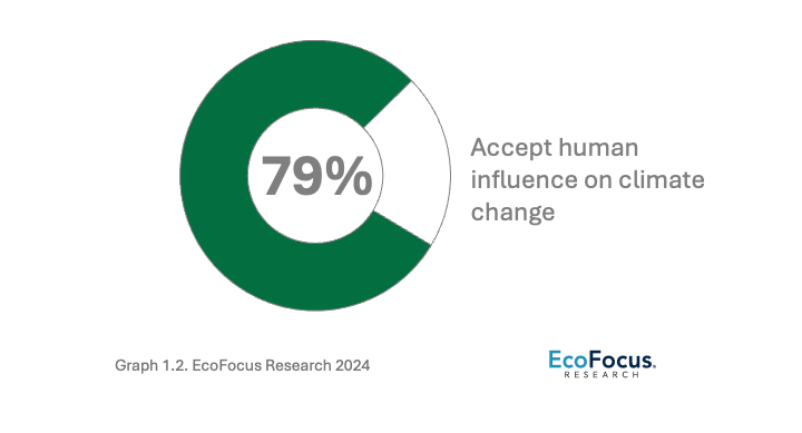There is broad consensus in the region that climate change is influenced by human activity. A combined 79% acknowledge human influence on climate change, with this split between primarily human-caused (42%) and partially human-caused (37%; Graph 1.2).
