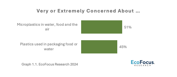When asked about more specific environmental concerns, water-related issues were among high environmental priorities, reflecting the region’s connection to their critical freshwater resources. Core concerns focus heavily on water pollution (69%) and plastic debris in oceans and waterways (70%), showing nearly identical levels of concern for these related issues. Looking more specifically, the concern extends to microplastics, with 51% very or extremely concerned about their presence in water, food, and air. Similarly, 45% show high concern about plastic used in packaging for food or water (Graph 1.1).