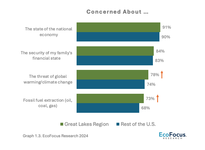 The 2024 EcoFocus Research Sustainability Survey finds that residents in the U.S. Great Lakes states of Minnesota, Wisconsin, Illinois, Indiana, Michigan, Ohio, Pennsylvania and New York (the U.S. Great Lakes region) express substantial concern with environmental issues. 78% of residents are worried about climate change threats and 73% about fossil fuel extraction. Their concern with these environmental issues notably exceeds that found in the rest of the United States.