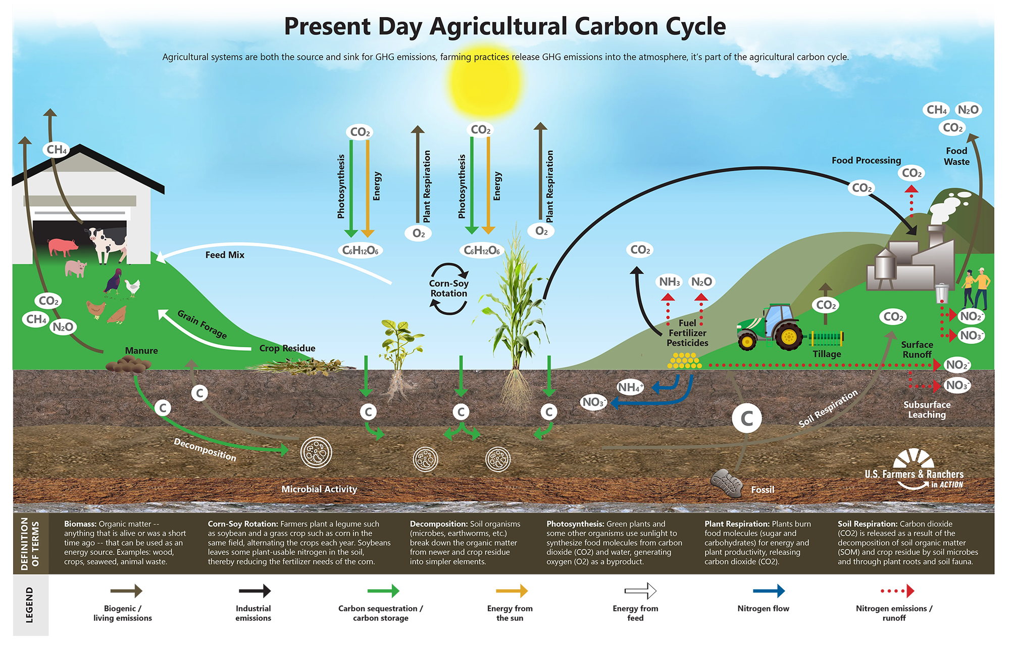 Carbon is the foundation for agricultural products beginning with the conversion of carbon dioxide into sugar through the process of photosynthesis and ultimately converted into compounds that are harvested through grains, fruit, vegetables, nuts, and fiber and animals convert into meat, milk, eggs, or wool. Carbon dioxide is released back to the atmosphere through processes associated with agricultural production along with methane from enteric fermentation in ruminants and nitrous oxide from nitrogen fertilizer use (Figure E1). These three comprise the greenhouse gases (GHG) that impact the environment. Currently, GHGs from agriculture represent about 10% of total emissions from all economic sectors in the United States[1]. One of the goals is to reduce these emissions. This report explores U.S. agriculture’s opportunities in GHG reduction for the benefit of producers, society and the environment.