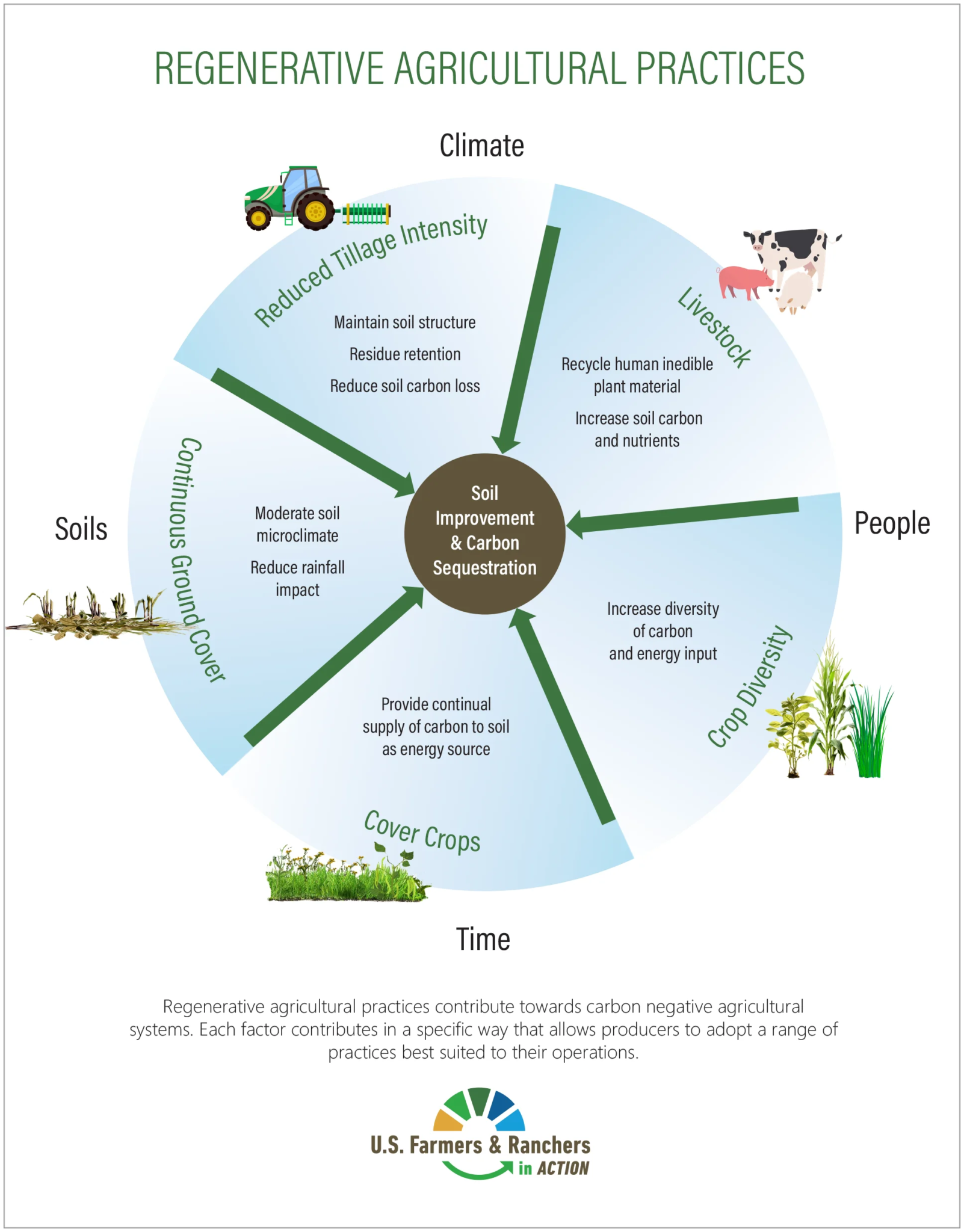 Within each of these broad categories, there are a number of currently available practices and emerging technologies that can positively impact emissions while improving both production and profitability. For example, within soil carbon management, the goal is to increase sequestration; however, this can be the result of a suite of regenerative agricultural practices, (e.g., reducing tillage intensity, increasing crop diversity, adding cover crops, maintaining continuous cover over the soil surface, and integrating livestock and manures to the cropping system). The impact of these practices is not confined to increasing soil carbon sequestration; but it extends to expanding nutrient and soil water availability for the crop. The combination of those effects increases crop productivity, reduces the yield gap and decreases the energy requirement for crop production when less tillage is used in the production system.